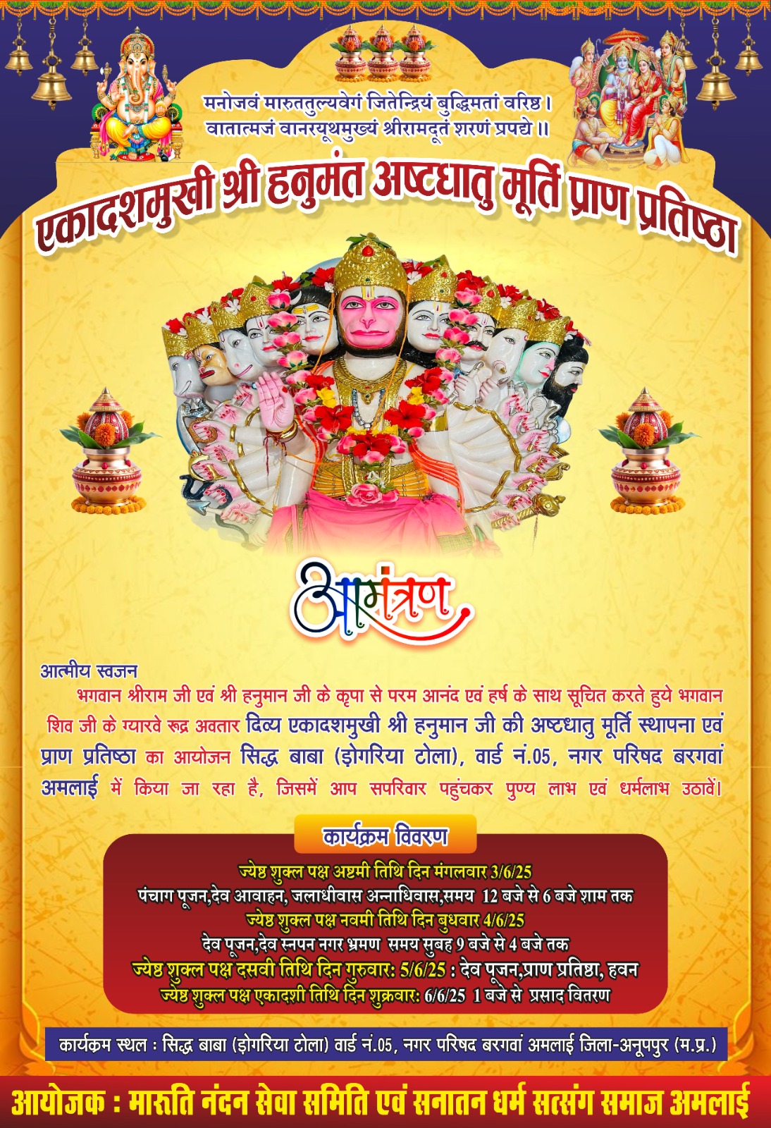 अमलाई (बरगवां)। नगर परिषद बरगवां के वार्ड क्रमांक 5 स्थित डोंगरिया टोला की पावन सिद्धबाबा पहाड़ी पर 5 जून 2025 को एक भव्य और दिव्य धार्मिक आयोजन होने जा रहा है। इस अवसर पर एकादशमुखी श्री हनुमान जी की अष्टधातु से निर्मित प्रतिमा की प्राण प्रतिष्ठा विधि-विधानपूर्वक संपन्न की जाएगी। इस ऐतिहासिक आयोजन की जिम्मेदारी मारुतिनंदन सेवा समिति ने अपने कंधों पर ली है, जो लगातार धार्मिक और सामाजिक कार्यों में सक्रिय रही है।कार्यक्रम का शुभारंभ 5 जून को दोपहर 1:00 बजे से देव पूजन के साथ होगा। इसके पश्चात मुख्य कार्यक्रम के अंतर्गत प्राण प्रतिष्ठा अनुष्ठान संपन्न किया जाएगा, जिसमें वैदिक मंत्रों की गूंज के बीच श्री हनुमान जी की प्रतिमा में प्राण प्रतिष्ठित किए जाएंगे। कार्यक्रम के अंतिम चरण में हवन और पूर्णाहुति का आयोजन होगा, जिसमें श्रद्धालु आहुति अर्पित कर पुण्य लाभ अर्जित करेंगे।एकादशमुखी हनुमान जी का विशेष महत्वएकादशमुखी हनुमान जी की प्रतिमा दुर्लभ और अत्यंत प्रभावशाली मानी जाती है। शास्त्रों के अनुसार, एकादशमुख स्वरूप में भगवान हनुमान 11 प्रकार की शक्तियों और रूपों का प्रतिनिधित्व करते हैं, जो भूत-प्रेत बाधा, नकारात्मक ऊर्जा, भय और दुर्भावनाओं का नाश करते हैं। अष्टधातु से निर्मित प्रतिमा का धार्मिक दृष्टि से विशेष महत्व होता है, क्योंकि यह स्थायित्व, ऊर्जा और आभामंडल का प्रतीक होती है।जनभागीदारी और आस्था का प्रतीकइस आयोजन को लेकर स्थानीय जनमानस में भारी उत्साह देखा जा रहा है। सिद्धबाबा पहाड़ी, जो पहले से ही एक आस्था का केंद्र रही है, अब इस प्राण प्रतिष्ठा के पश्चात और भी अधिक धार्मिक महत्ता प्राप्त कर लेगी। स्थानीय श्रद्धालुओं सहित आसपास के गांवों से भी भारी संख्या में भक्तों के पहुंचने की संभावना है।मारुतिनंदन सेवा समिति ने समस्त श्रद्धालुजनों, सामाजिक संगठनों और धर्मप्रेमियों से अनुरोध किया है कि वे इस पुण्य अवसर पर उपस्थित होकर हनुमंत शक्ति के इस दिव्य प्रसंग का साक्षी बनें और धर्म लाभ प्राप्त करें।