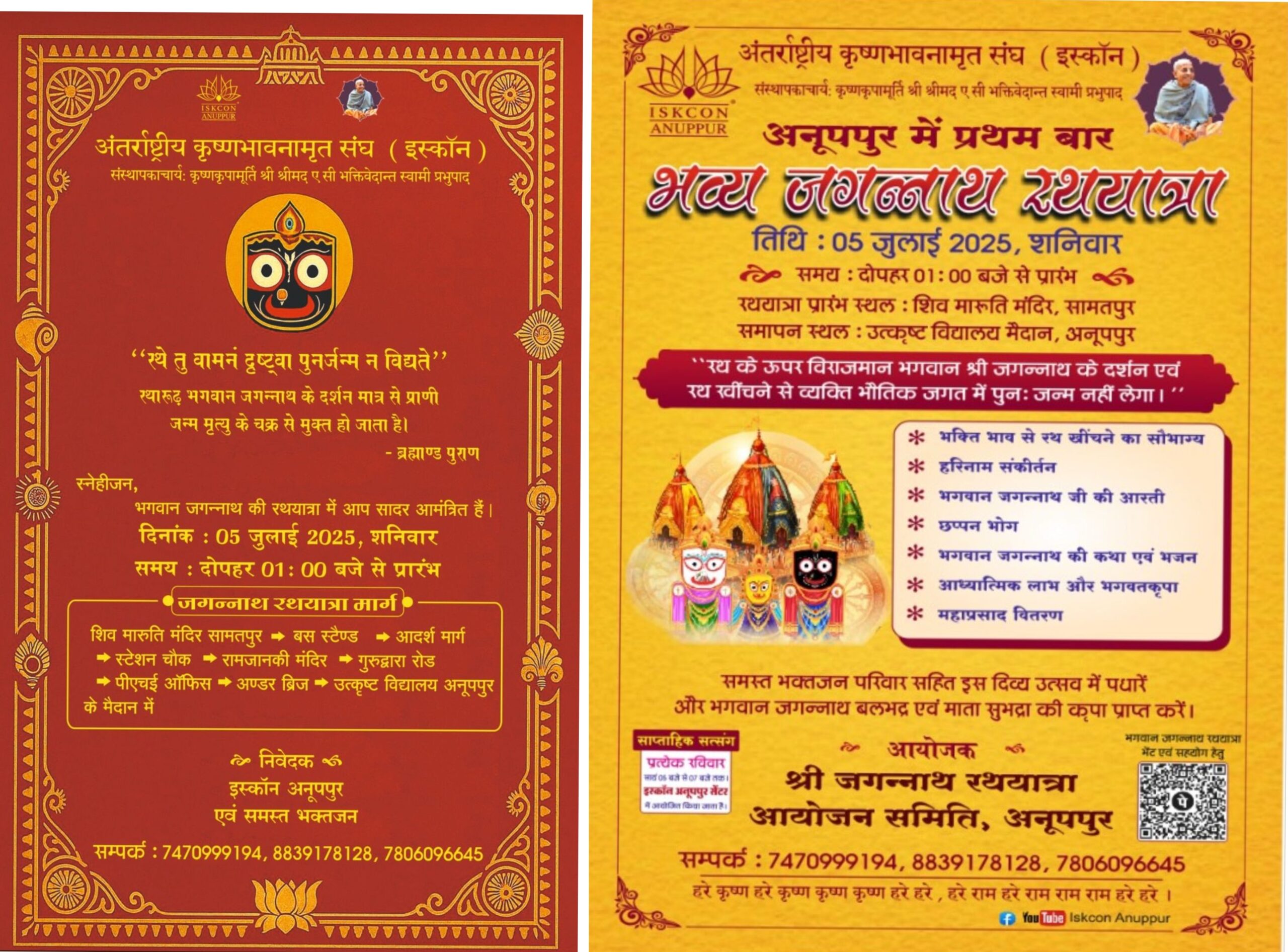 श्री जगन्नाथ रथ यात्रा शिव मारुति मंदिर, सामतपुर से दोपहर 1:00 बजे प्रारंभ होगी। रथ यात्रा बस स्टैंड, आदर्श मार्ग, स्टेशन चौक, राम जानकी मंदिर, गुरुद्वारा रोड, पीएचई ऑफिस, अंडर ब्रिज, और स्मार्ट सिटी से होते हुए उत्कृष्ट विद्यालय मैदान, अनूपपुर में समाप्त होगी। इस दौरान हरिनाम संकीर्तन, भक्तों द्वारा नृत्य, और महाप्रसाद वितरण जैसे कार्यक्रम आयोजित होंगे।छप्पन भोग और समापन समारोह
