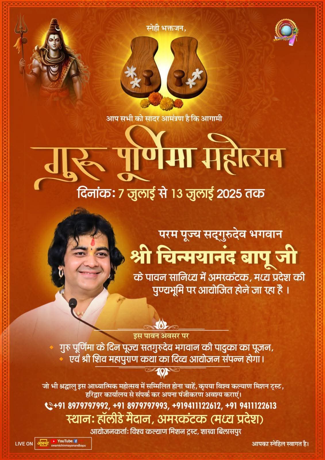 अमरकंटक । पवित्र नगरी अमरकंटक में विश्व कल्याण मिशन ट्रस्ट शाखा बिलासपुर के तत्वाधान में 7 जुलाई 25 दिन सोमवार आसान शुक्ल द्वादशी अनुराधा नक्षत्र से 13 जुलाई 25 दिन रविवार श्रावण मास कृष्ण पक्ष तृतीया श्रवण नक्षत्र सात दिवसीय धार्मिक एवं आध्यात्मिक गुरु पूर्णिमा महोत्सव का भव्य एवं विशाल आयोजन मेला मैदान मैं भक्त श्रद्धालुओं द्वारा धर्म मय आयोजन किया जाना है इस पावन पुनीत अवसर पर शिव महापुराण की कथा परम पूज्य सदगुरुदेव भगवान श्री चिन्मयानंद बापू जी के पावन सानिध्य मे आयोजित होना है । अगाध भक्ति, अपार श्रद्धा और अविस्मरणीय आध्यात्मिक अनुभव का लाभ गुरु पूर्णिमा महोत्सव पर शिष्यों एवं भक्तों को मिलेगा ।