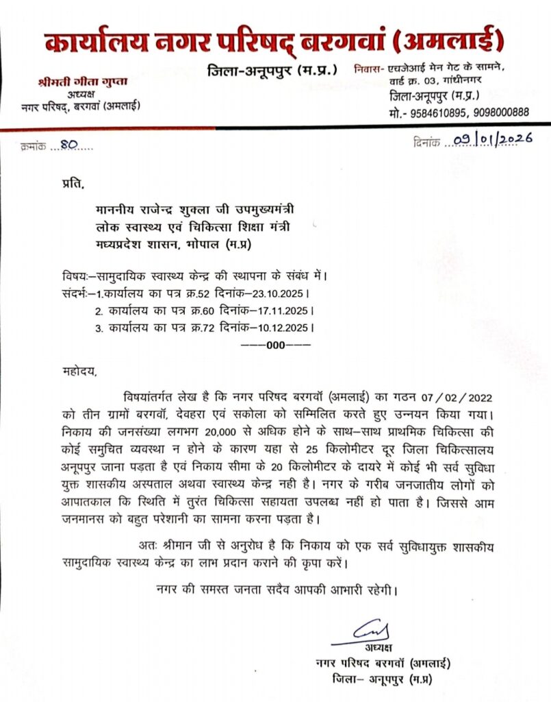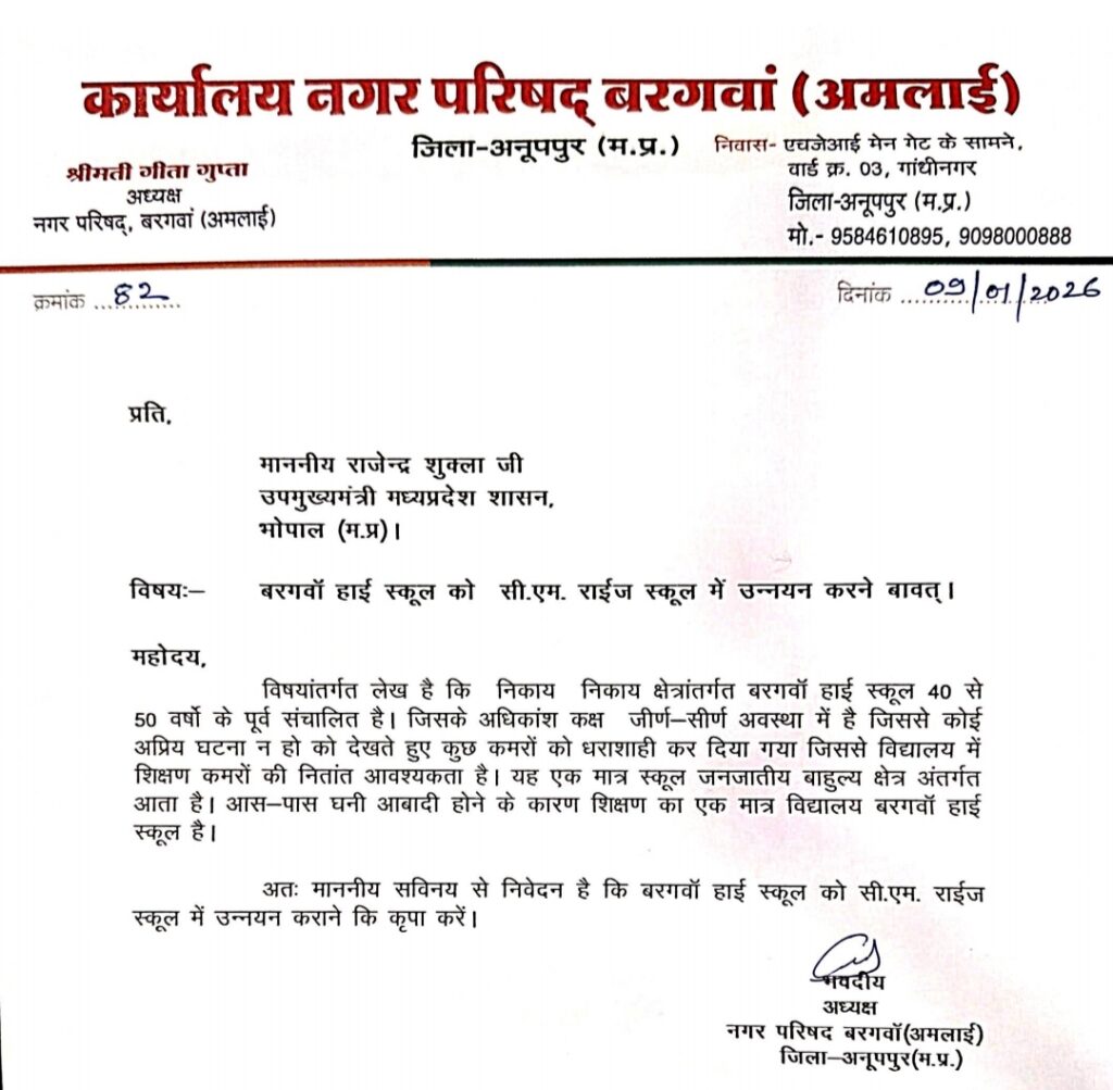 अनूपपुर बरगवां (अमलाई), अनूपपुर।नगर परिषद बरगवां (अमलाई) क्षेत्र लंबे समय से स्वास्थ्य और शिक्षा जैसी बुनियादी सुविधाओं की कमी से जूझ रहा है। आमजन की इन्हीं समस्याओं को लेकर नगर परिषद ने मध्यप्रदेश शासन का ध्यान आकर्षित करते हुए दो अत्यंत महत्वपूर्ण मांगें रखी हैं। परिषद अध्यक्ष श्रीमती गीता गुप्ता द्वारा दिनांक 09 जनवरी 2026 को शासन को प्रेषित पत्रों में एक ओर सामुदायिक स्वास्थ्य केंद्र की स्थापना तथा दूसरी ओर बरगवां हाई स्कूल को सीएम राइज स्कूल में उन्नयन करने की आवश्यकता को विस्तार से रखा गया है।20 हजार की आबादी, पर स्वास्थ्य सुविधाएं नदारद नगर परिषद बरगवां (अमलाई) का गठन 07 फरवरी 2022 को किया गया था। इसके अंतर्गत बरगवां, नगमा और सकरेला ग्राम शामिल हैं। वर्तमान में यहां की जनसंख्या 20 हजार से अधिक है, लेकिन इसके अनुपात में स्वास्थ्य सेवाएं लगभग शून्य हैं। परिषद द्वारा भेजे गए पत्र में स्पष्ट किया गया है कि क्षेत्र में प्राथमिक चिकित्सा तक की समुचित व्यवस्था नहीं है।बीमारी या दुर्घटना की स्थिति में मरीजों को लगभग 25 किलोमीटर दूर जिला चिकित्सालय अनूपपुर ले जाना पड़ता है। इससे न केवल समय की बर्बादी होती है, बल्कि कई बार गंभीर मरीजों की हालत रास्ते में ही बिगड़ जाती है। नगर परिषद की सीमा के 20 किलोमीटर के दायरे में भी कोई सर्वसुविधायुक्त शासकीय अस्पताल या स्वास्थ्य केंद्र उपलब्ध नहीं है। आपातकालीन परिस्थितियों में एंबुलेंस और त्वरित इलाज की सुविधा न होने से आम नागरिकों को भारी परेशानी उठानी पड़ती है।नगर परिषद ने शासन से बरगवां (अमलाई) में एक सर्वसुविधायुक्त शासकीय सामुदायिक स्वास्थ्य केंद्र की स्थापना करने की मांग की है, ताकि स्थानीय लोगों को अपने ही क्षेत्र में इलाज की सुविधा मिल सके और जिला अस्पताल पर बढ़ते दबाव को भी कम किया जा सके।जर्जर भवन में संचालित एकमात्र स्कूल स्वास्थ्य के साथ-साथ शिक्षा व्यवस्था भी बरगवां (अमलाई) क्षेत्र की बड़ी चिंता बनी हुई है। परिषद द्वारा भेजे गए दूसरे पत्र में बताया गया है कि बरगवां हाई स्कूल लगभग 40 से 50 वर्षों से संचालित हो रहा है। यह विद्यालय क्षेत्र का एकमात्र शासकीय हाई स्कूल है, जहां आसपास के गांवों के सैकड़ों छात्र-छात्राएं अध्ययनरत हैं।विद्यालय का भवन काफी पुराना और जर्जर अवस्था में है, जिससे किसी भी समय गंभीर हादसे की आशंका बनी रहती है। इसके बावजूद यही स्कूल जनजातीय बहुल क्षेत्र में शिक्षा का एकमात्र केंद्र है। आसपास घनी आबादी होने के कारण विद्यार्थियों के पास पढ़ाई के लिए कोई अन्य विकल्प भी उपलब्ध नहीं है।सीएम राइज स्कूल से बदलेगी तस्वीरनगर परिषद का मानना है कि यदि बरगवां हाई स्कूल को सीएम राइज स्कूल में उन्नयन किया जाता है, तो