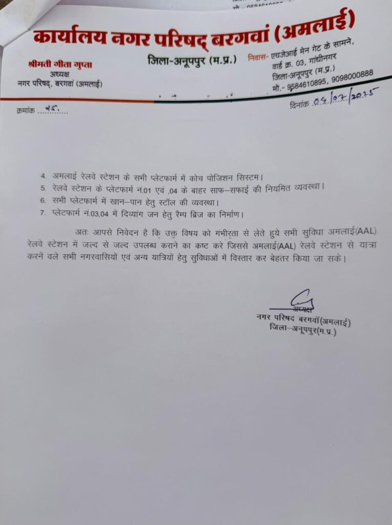 अमलाई (अनूपपुर)। वर्षों से सुविधाओं की कमी से जूझ रहे अमलाई रेलवे स्टेशन के विकास को लेकर नगर परिषद बरगवां (अमलाई) ने जिस दृढ़ता से आवाज उठाई थी, अब वह धरातल पर उतरती दिखाई दे रही है। नगर परिषद अध्यक्ष श्रीमती गीता गुप्ता ने हाल ही में अमलाई रेलवे स्टेशन में डीआरएम दक्षिण पूर्व मध्य रेलवे (SECR) बिलासपुर से व्यक्तिगत रूप से मुलाकात कर स्टेशन को सर्वसुविधायुक्त बनाने हेतु मांग पत्र सौंपा था। इस मांग पत्र में यात्रियों की मूलभूत समस्याओं से लेकर आधुनिक सुविधाओं तक का विस्तृत उल्लेख किया गया था।इसी क्रम में डीआरएम SECR बिलासपुर द्वारा अमलाई रेलवे स्टेशन का विस्तृत एवं गंभीर निरीक्षण किया गया। निरीक्षण के दौरान नगर परिषद अध्यक्ष गीता गुप्ता के साथ युवा भाजपा नेता अभिषेक गुप्ता तथा नगर के नागरिक पार्षद उपस्थित रहे। सभी जनप्रतिनिधियों ने स्टेशन परिसर में मौजूद समस्याओं को मौके पर दिखाते हुए यात्रियों को हो रही परेशानियों से डीआरएम को अवगत कराया।निरीक्षण में प्रमुख रूप से स्टेशन के आसपास की जर्जर सड़कों की मरम्मत, पर्याप्त स्ट्रीट लाइट व्यवस्था, नियमित साफ़-सफ़ाई, प्लेटफार्मों की बेहतर देखरेख तथा यात्रियों के बैठने, पानी और छाया की सुविधाओं को लेकर विस्तार से चर्चा हुई। इसके साथ ही अमलाई जैसे औद्योगिक क्षेत्र से जुड़े महत्वपूर्ण स्टेशन पर लंबी दूरी की प्रमुख एक्सप्रेस ट्रेनों के ठहराव की आवश्यकता पर भी जोर दिया गया, जिससे स्थानीय नागरिकों, मजदूरों एवं व्यापारियों को सीधा लाभ मिल सके।नगर परिषद द्वारा पूर्व में भेजे गए पत्रों में स्पष्ट रूप से बताया गया था कि अमलाई स्टेशन दक्षिण पूर्व मध्य रेलवे के राजस्व की दृष्टि से महत्वपूर्ण केंद्र है, जहां से प्रतिदिन बड़ी संख्या में यात्री एवं माल परिवहन होता है। इसके बावजूद यहां बुनियादी सुविधाओं की भारी कमी लंबे समय से बनी हुई है। पत्रों में कोच पोजीशन सिस्टम लगाने, प्लेटफार्मों के बाहर साफ़-सफ़ाई की स्थायी व्यवस्था करने, खान-पान स्टॉल शुरू करने, प्लेटफार्म नंबर 03 और 04 पर दिव्यांग यात्रियों के लिए रैम्प ब्रिज निर्माण तथा स्टेशन क्षेत्र में सड़क और प्रकाश व्यवस्था सुधारने की मांग प्रमुखता से रखी गई थी।डीआरएम ने पूरे स्टेशन परिसर का बारीकी से निरीक्षण करते हुए सभी मांगों को गंभीरता से सुना और अधिकारियों को आवश्यक दिशा-निर्देश दिए। उन्होंने भरोसा दिलाया कि अमलाई रेलवे स्टेशन को चरणबद्ध तरीके से आधुनिक सुविधाओं से लैस किया जाएगा और यात्रियों की परेशानियों को प्राथमिकता से दूर किया जाएगा।इस अवसर पर नगर परिषद अध्यक्ष गीता गुप्ता ने कहा कि अमलाई की जनता लंबे समय से बेहतर रेलवे सुविधाओं की प्रतीक्षा कर रही थी और आज डीआरएम का न